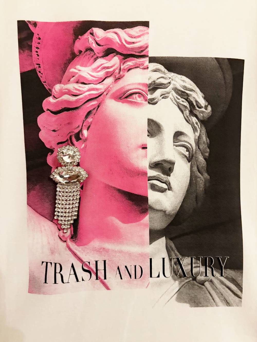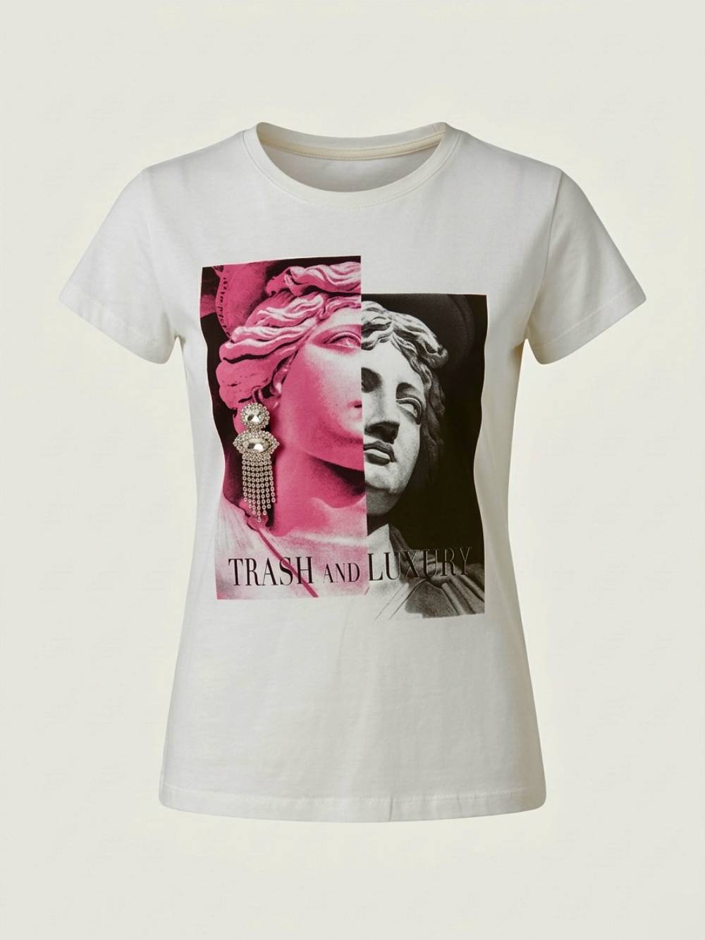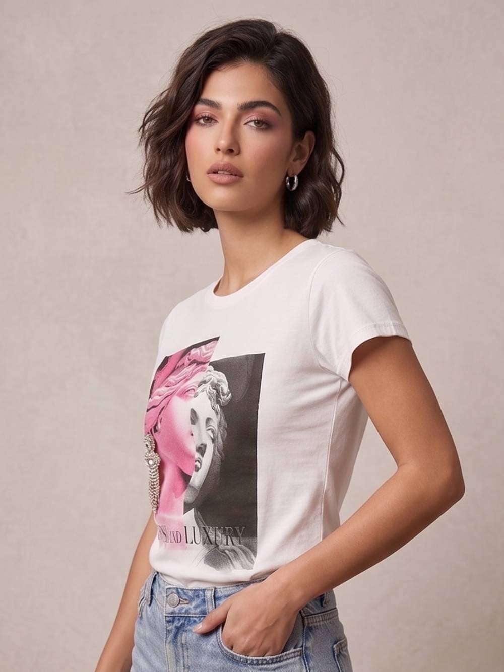 Αναβαθμίστε την καθημερινή σας γκαρνταρόμπα με αυτό το λευκό t- με τη μοντέρνα pop αισθητική, δημιουργώντας ένα look που ισορροπεί ανάμεσα στο διαχρονικό και το ανατρεπτικό.